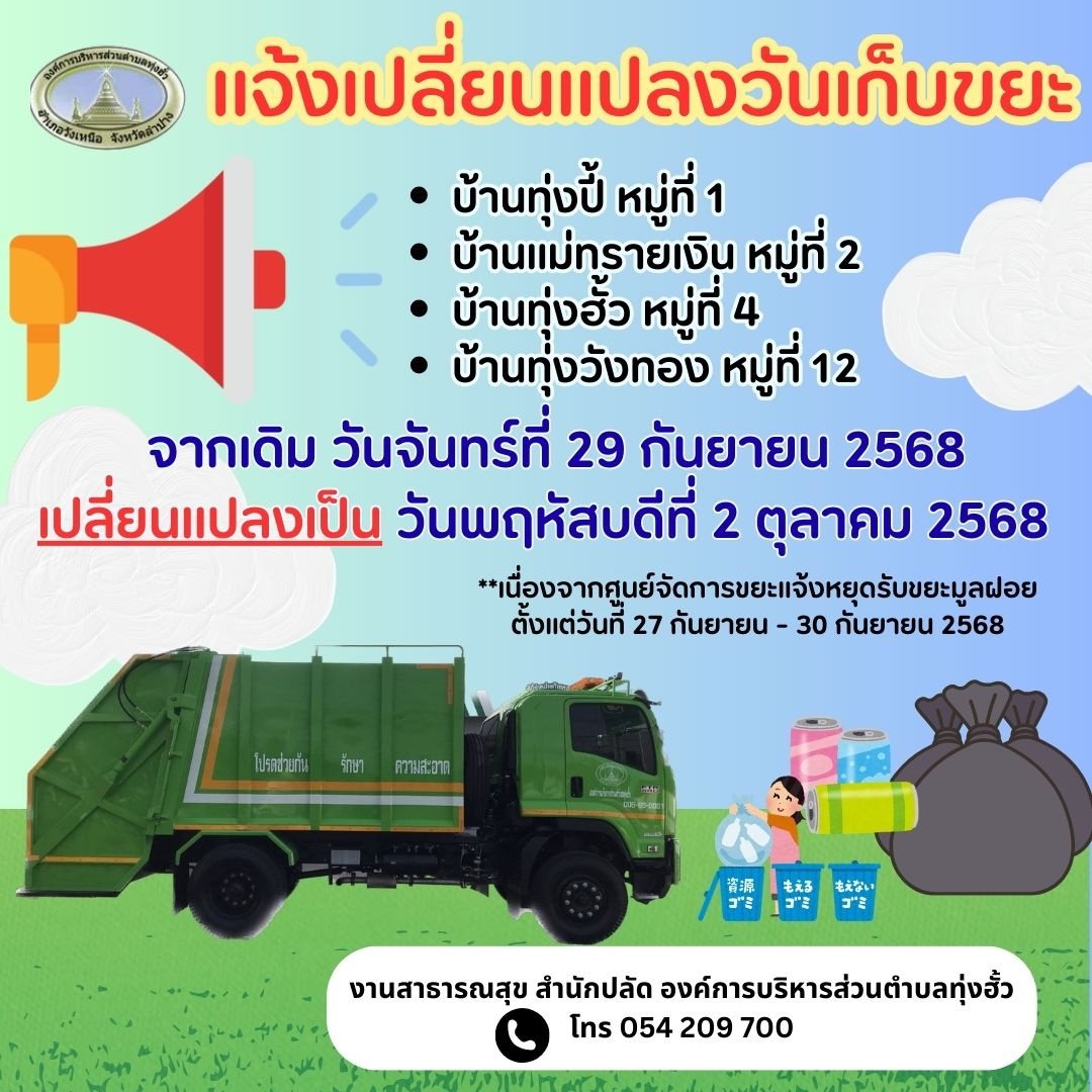 จากเดิม วันจันทร์ที่ 29 กันยายน 2568 ตั้งแต่เวลา 07.30 น. เปลี่ยนแปลงเป็น วันพฤหัสบดีที่ 2 ตุลาคม 2568 ตั้งแต่เวลา 07.30 น. เป็นต้นไป เนื่องจากศูนย์จัดการขยะทาง อบจ.ลำปางปิดให้บริการชั่วคราว